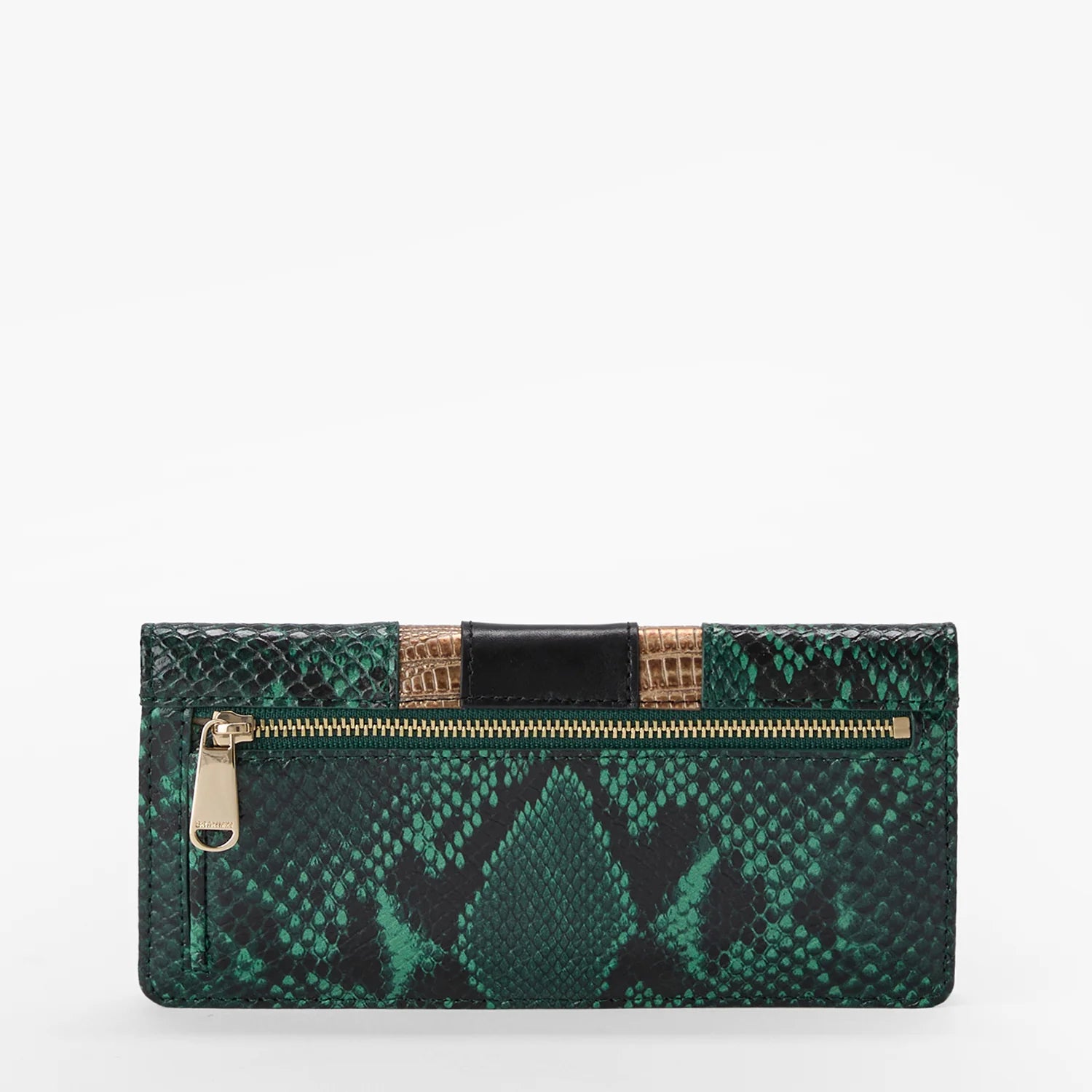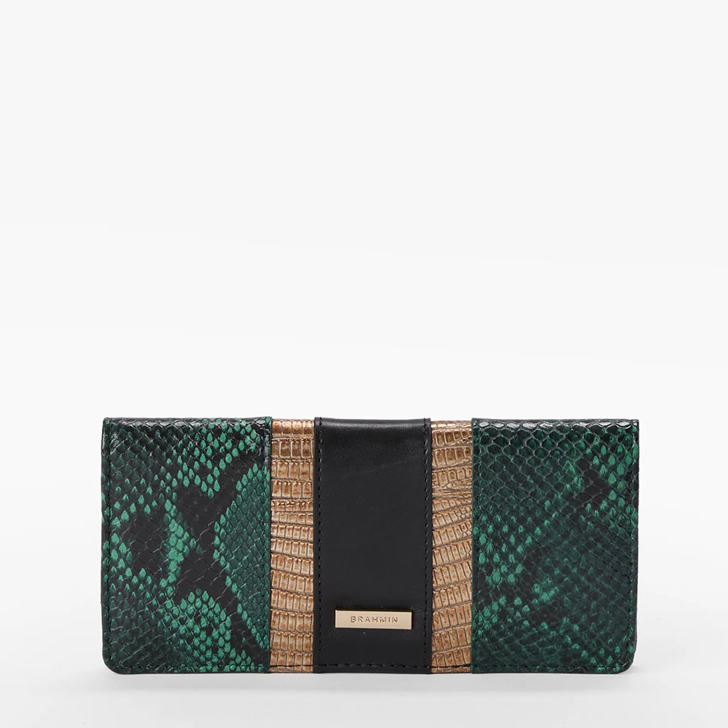 Featured in Multi Venezia, a chic combination of elevated textures and rich color. This deep emerald snake print has touches of gold lizard and rich black smooth leather. Handbags feature an oval buckle with leather inlay details for a refined statement. Made with genuine leather.